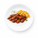 Chicken wings with BBQ sauce (served with fries).