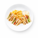 Toast bread, chicken fillet, bacon, ham, yellow cheese, tomato, lettuce, mayonnaise (served with fries).
