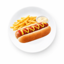Hot dog bun, sausage, ketchup, mustard (served with fries).